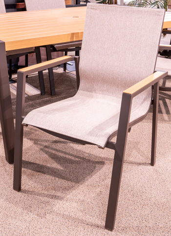 Whether you're a morning coffee on the porch or a nighttime read on the patio person, this outdoor sling arm chair brings contemporary flair to outdoor living. A combination of wood-look aluminum and a sleek black finish lends modern, neutral appeal. A sling-style seat keeps you comfortable as you lounge. Made to weather the elements, this chair expertly combines the style you love with the durability you need.