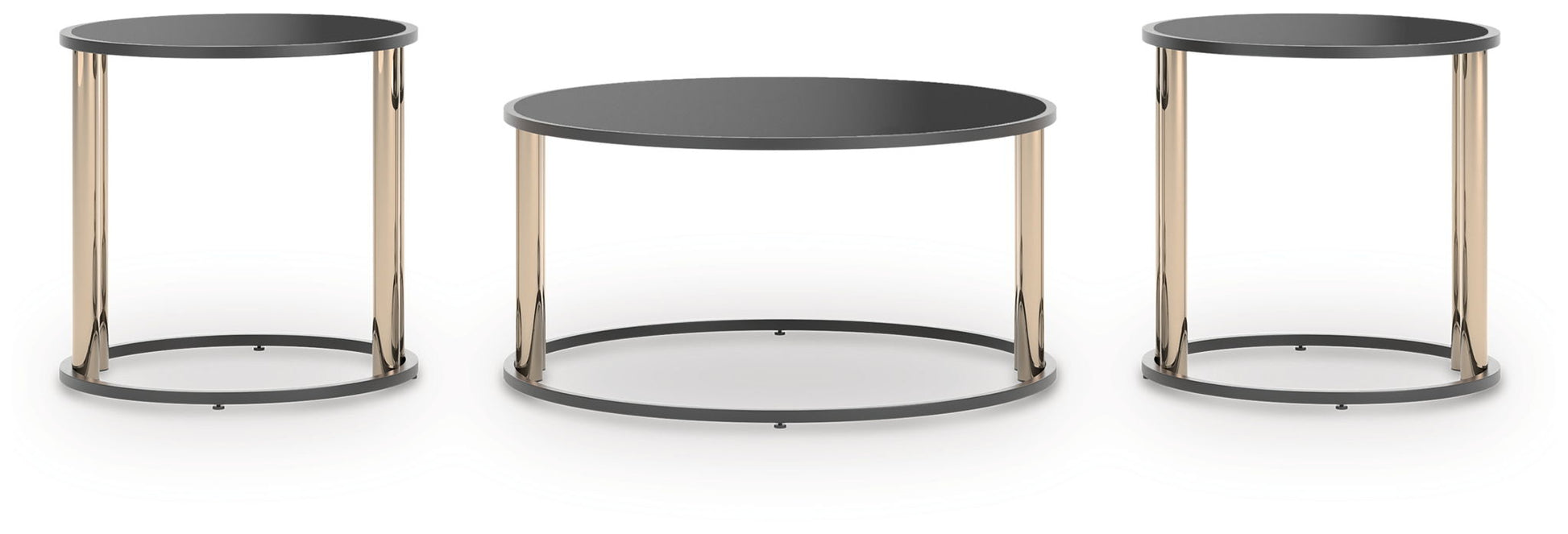 Round up a sleek, modern look with this table set. The rounded black glass tops offer the perfect perch for drinks, snacks or decor displays. Shapely brass-tone legs provide an eye-catching contrast to the matte black frames. Complete with a coffee table and two end tables, this sharp-looking table set easily complements other contemporary pieces.