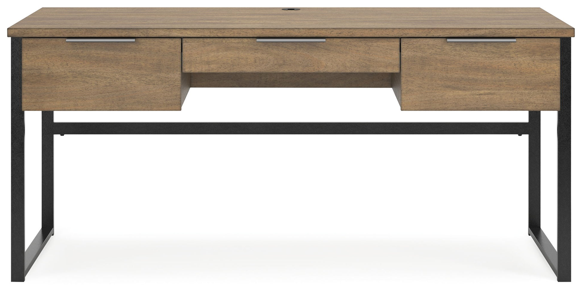 Urban Contemporary design. Made with Mango wood veneer, MDF substrate and metal frames. Finished in a light brown wood tone with contrasting gunmetal gray frames. Desk features 3 drawers and open raceway on the back side to help keep wires and power supplies neatly tucked out of sight. Matching bookcase with five 58" wide gallery shelves.