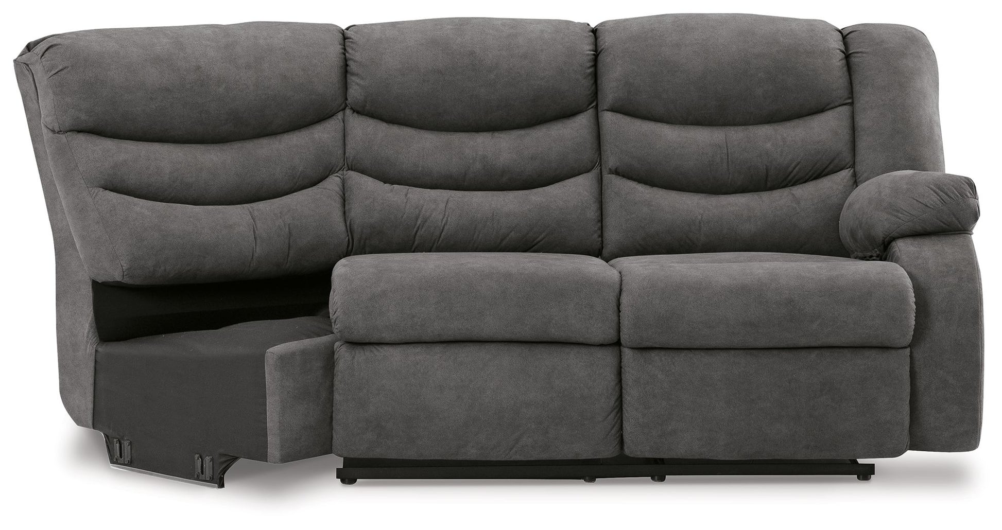 This right-arm facing reclining loveseat with half wedge is made with faux leather upholstery. Pairs with other items in the series to make a sectional.